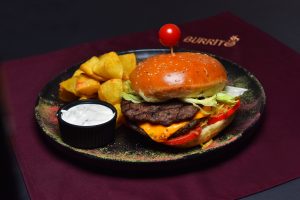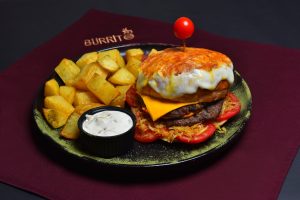 200 گرم گوشت،میکس چند نوع پنیر، پیاز کاراملی ، کاهو ، گوجه فرنگی، سیب زمینی خلالی، سس مخصوص، سیب زمینی سرخ شده