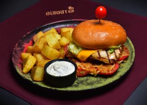 170 گرم سینه مرغ، سس قارچ ، پنیر جدار، پیاز کاراملی ، کاهو ، گوجه فرنگی، سیب زمینی خلالی، سس مخصوص، سیب زمینی سرخ شده