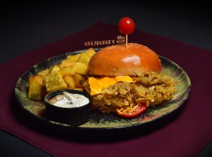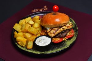 برگر گوشت ، فیله مرغ ، سس قارچ ، پنیرچدار ، پیاز کاراملی ، کاهو ، گوجه فرنگی ، سیب زمینی خلالی ، سس مخصوص، سیب زمینی سرخ شده