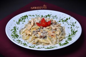 سینه مرغ، قارچ، سیر،پنیر پارمیسان، جعفری و ریحان، سس آلفردو