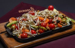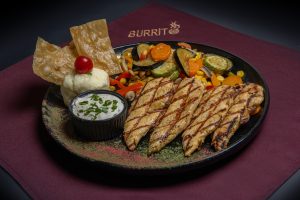 مرغ گریل شده ، گوشت گریل شده ، فلفل دلمه ، پیاز ، نان ترتیلا ، سس سالسا