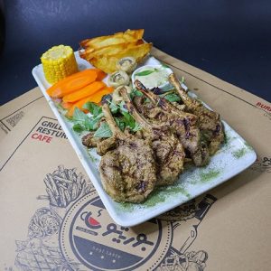 6۰۰گرم راسته گوسفندی با استخوان ، سرو با پوره سیب زمینی و سبزیجات ، سس مخصوص ،سس قارچ
