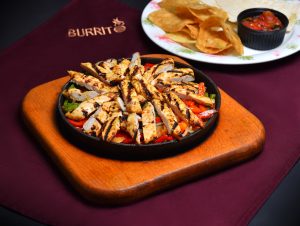 مرغ گریل شده ، گوشت گریل شده ، فلفل دلمه ، پیاز ، نان ترتیلا ، سس سالسا