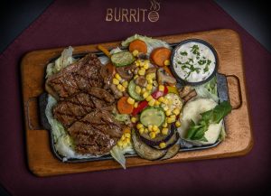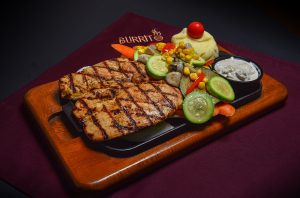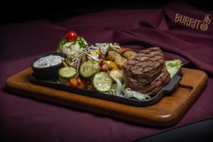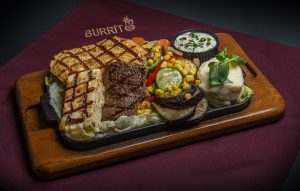 ۱۵۰گرم فیله گوساله مزه دار شده، ۱۵۰ گرم سینه مرغ مزه دار شده، پنیر هالومی کبابی، سس مخصوص ، سرو با پوره سیب زمینی و سبزیجات