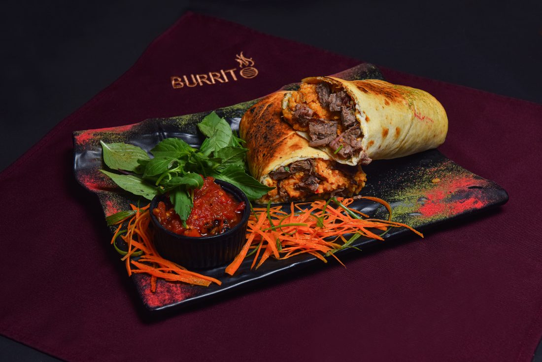 نان ترتیلا ، پنیر پیتزا ، گوشت استیک مزه دار شده ،برنج مکزیکی، سس لوبیا، جعفری، سس سالسا، گشنیز، سس مخصوص