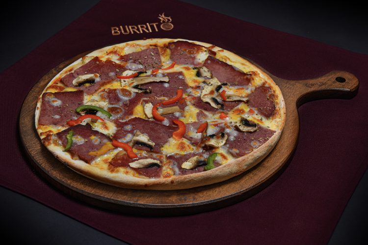 بیکن گوشت،قارچ ، میکس چند نوع پنیر ، فلفل دلمه ای ، میکس چند نوع پنیر، سس مخصوص بوریتو