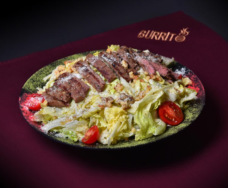 فیله گوساله مزه دار شده ، کاهو ، گردو ، پنیر پارمیسان ، سس آنتروکوت