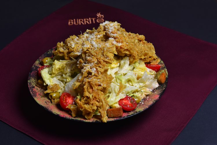 سینه مرغ سوخاری مزه دار شده ، کاهو ،نان تست مزه دار شده ،گوجه چری ،پنیر پارمیسان، سس سزار