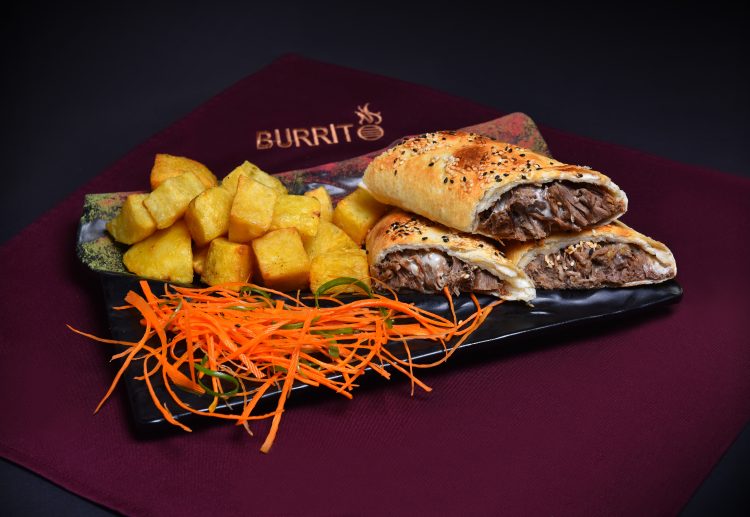 گوشت راسته مزه دار شده، پیاز کاراملی ، سس قارچ،پنیر پیتزا، سیب زمینی سرخ شده