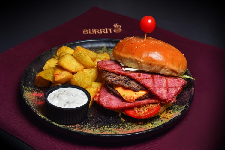 200 گرم گوشت ، بیکن، سس قارچ، پنیر جدار، پیاز کاراملی ، کاهو ، گوجه فرنگی، سیب زمینی خلالی، سس مخصوص، سیب زمینی سرخ شده