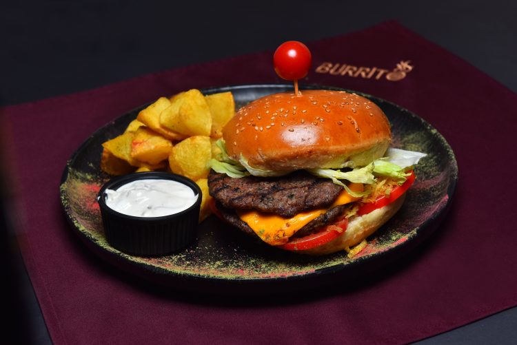 200 گرم گوشت، سس قارچ، پنیر جدار، پیاز کاراملی، کاهو، گوجه فرنگی، سیب زمینی خلالی، سس مخصوص، سیب زمینی سرخ شده