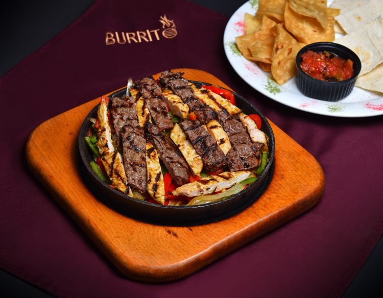 مرغ گریل شده ، گوشت گریل شده ، فلفل دلمه ، پیاز ، نان ترتیلا ، سس سالسا