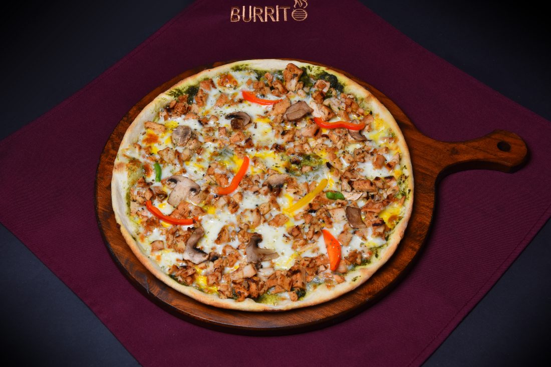 سینه مرغ مزه دار شده، فلفل دلمه، قارچ ، میکس چند نوع پنیر، سس پستو یا سس گوجه
