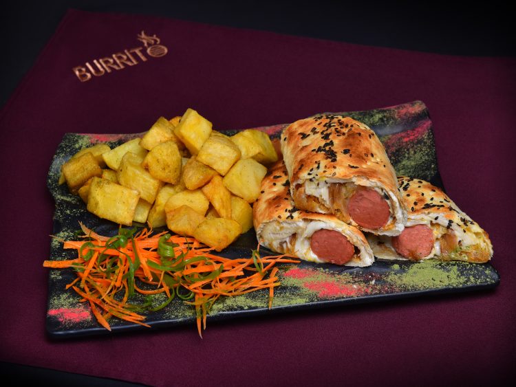 هات داگ گریل شده، پیاز کاراملی ، قارچ، سیب زمینی خلالی ، پنیر پیتزا، سس مخصوص، سیب زمینی سرخ شده
