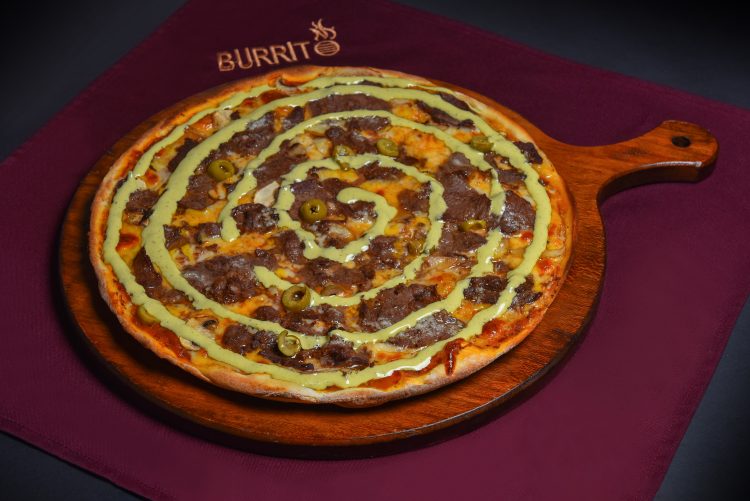 گوشت استیک مزه دار شده، قارچ، زیتون، سس سیر، میکس چند نوع پنیر، سس مخصوص بوریتو
