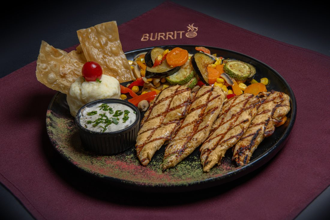 250 گرم فیله مرغ گریل شده، سرو با پوره سیب زمینی و سبزیجات ، سس قارچ