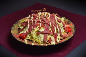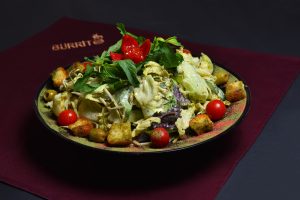 کاهو، جوانه ماش، نان تست مزه دار، گوجه گیلاسی، خیار، مغز تخمه، ریحان، نعنا، زیتون، سس میکس مخصوص