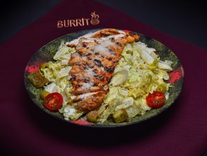 سینه مرغ مزه دار شده،کاهو،نان تست مزه دار شده،گوجه گیلاسی ، زیتون ،پنیر پارمیسان ،سس سزار