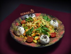 کرفس، هویج، جوانه ماش، زیتون، گوجه گیلاسی، خیار، نعنا، گردو، پنیر فتا، سس گرین بوریتو